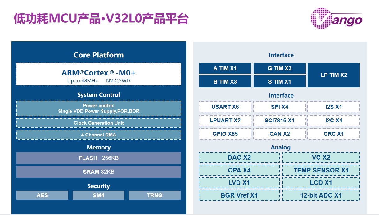 V32L0系列是一款基于泰山內(nèi)核,全新的設(shè)計理念,改進了調(diào)試和追蹤能力以及Flash訪問的兩級流水線,減少了每條指令循環(huán)(IPC)數(shù)量,是一款具有超低功耗,寬電壓工作范圍的MCU,具備以下特點: