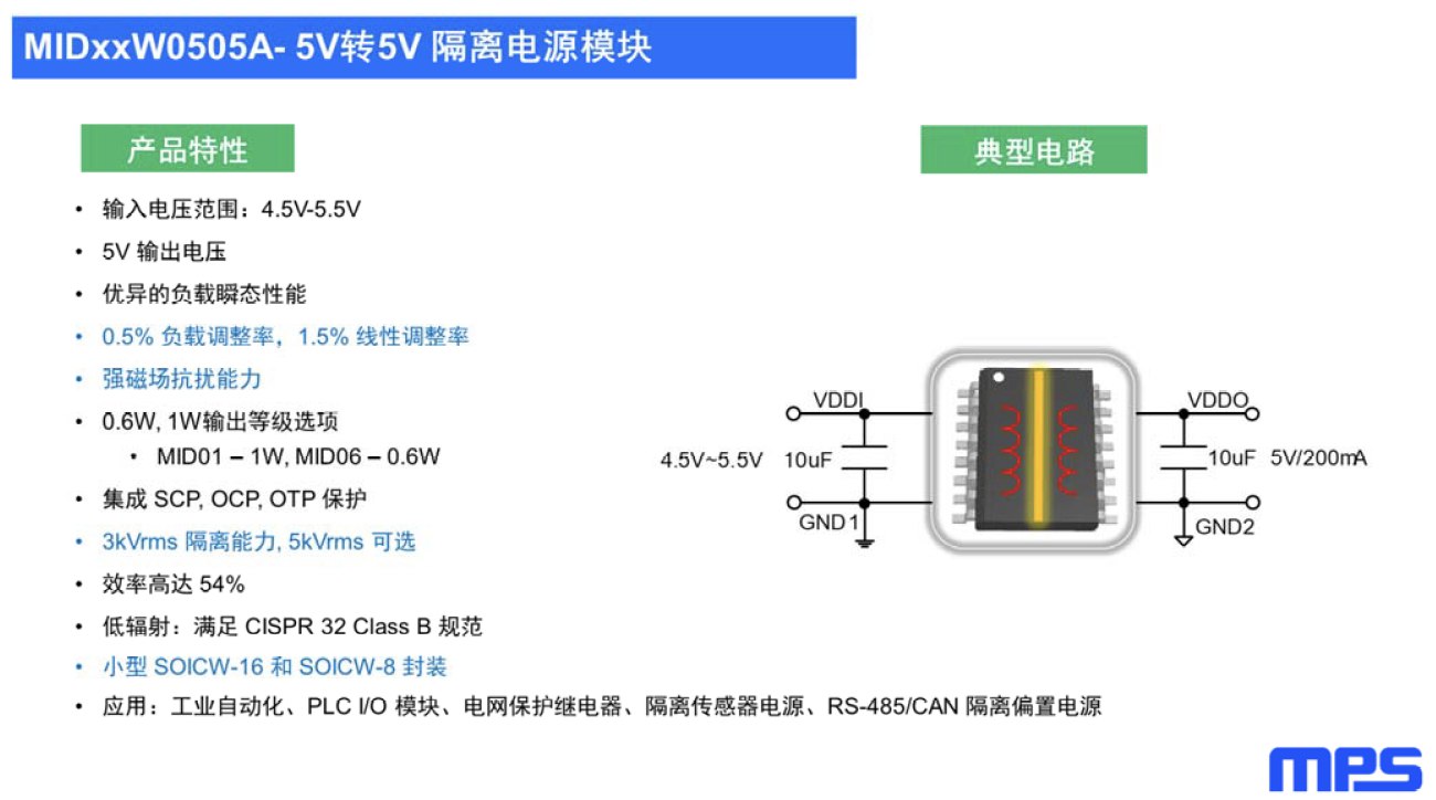 針對這一產(chǎn)品,MPS還搭配了隔離電源模塊MIDxxW0505系列。據(jù)悉,某些客戶在設(shè)計(jì)當(dāng)中,需要一個(gè)單獨(dú)的隔離供電給到其它的IO口,例如一些總線協(xié)議等;收發(fā)器里面可能需要單獨(dú)的5V轉(zhuǎn)5V的電源轉(zhuǎn)換。在這種客戶的應(yīng)用設(shè)計(jì)需求上,MIDxxW0505隔離電源模塊就非常契合。