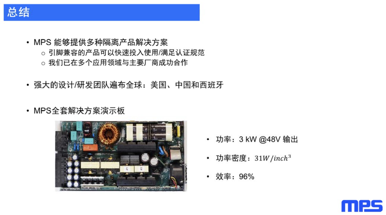 除了以上的芯片級、模塊級的隔離產(chǎn)品外,MPS還提供了“大功率解決方案的演示板”,上面搭載了MPS諸多不同類型的優(yōu)勢隔離和電源產(chǎn)品,整體設(shè)計(jì)的功率密度達(dá)到了241W/cm3,方便客戶在選型階段進(jìn)行器件評估,也可以參考這個(gè)高功率的設(shè)計(jì)來設(shè)計(jì)自己所需的供電方案。