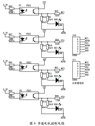 為了將污水抽入瓶中,采用蠕動(dòng)泵實(shí)現(xiàn),蠕動(dòng)泵內(nèi)壓有 軟管,通過蠕動(dòng)泵不斷對(duì)軟管的擠壓,這樣實(shí)現(xiàn)污水的采樣。 為了控制蠕動(dòng)泵采樣污水的量,設(shè)計(jì)中采用步進(jìn)電機(jī)進(jìn)行控制, 控制電路如圖4所示。通過測(cè)量步進(jìn)電機(jī)每100步對(duì)應(yīng)的采樣 量,然后推算出實(shí)際需采樣的量對(duì)應(yīng)的步進(jìn)電機(jī)步數(shù)。達(dá)到 精確控制采樣量的要求。