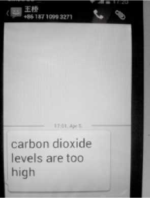 如果人為地使節(jié)點(diǎn)采集到二氧化碳的溶度超過(guò)閾值,這 時(shí),觀察終端手機(jī)接收情況如圖7所示,也就是終端手機(jī)的 短信圖??梢?jiàn),其結(jié)果是成功收到基站發(fā)來(lái)的一條短信,并正 確的收到了短信內(nèi)容,通知業(yè)主,從而達(dá)到了預(yù)期的目的。