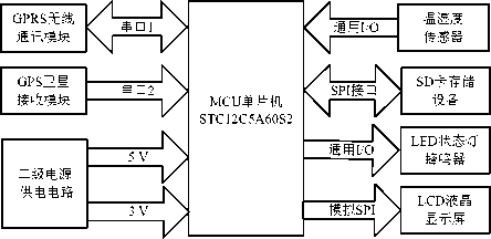控制芯片采用宏晶公司的STC12C5A60S2系列,該款芯片集成雙串口,內(nèi)置1KB的擴(kuò)展RAM和60KB的ROM,并提供了1KB的E2PROM和SPI硬件接口,單片機(jī)通過兩個(gè)串口以及SPI接口和普通的IO口對(duì)溫濕度和位置信息進(jìn)行處理。數(shù)據(jù)可以在駕駛室內(nèi)的LCD實(shí)時(shí)顯示,駕駛員可以即時(shí)了解運(yùn)輸狀況。