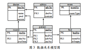 針對(duì)信息分析系統(tǒng)的特點(diǎn),根據(jù)用戶職務(wù)、病人和終端的 分類,設(shè)計(jì)了一系列的關(guān)系數(shù)據(jù)表。每個(gè)實(shí)體類都對(duì)應(yīng)數(shù)據(jù)庫(kù) 中的一張表,且各表都有一定的關(guān)聯(lián)關(guān)系,例如,病人表中主 治醫(yī)生的ID號(hào)是來自于醫(yī)生表中的醫(yī)生ID號(hào),病床表的病 房號(hào)來自病床表的ID號(hào)。圖3給出了幾張主要表的數(shù)據(jù)關(guān)系 模型圖。其中生理數(shù)據(jù)等表中的數(shù)據(jù)將被傳入Hadoop集群進(jìn) 行分析處理,并得出智能分析結(jié)果。