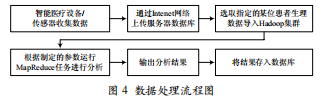 在系統(tǒng)中,數(shù)據(jù)通過傳感器和智能醫(yī)療設(shè)備收集,然后 通過網(wǎng)絡(luò)上傳到數(shù)據(jù)庫(kù)服務(wù)器。在對(duì)患者做出智能分析時(shí), 系統(tǒng)將選取指定的某項(xiàng)生理數(shù)據(jù),導(dǎo)人Hadoop集群,并對(duì)數(shù) 據(jù)進(jìn)行分析,得出結(jié)果。整個(gè)流程如圖4所示。
