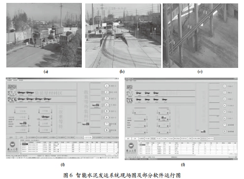 智能水泥發(fā)運(yùn)系統(tǒng)在鞍山、沈陽(yáng)等水泥廠使用,各項(xiàng)功能正常,解決了車輛秩序混亂、汽車衡檢斤作弊、下料口偷料裝錯(cuò)料等問(wèn)題。日發(fā)運(yùn)量由以前 6 000 t 增長(zhǎng)到現(xiàn)在 8 000 t。圖 6 所示的(a)、(b)、(c)分別為現(xiàn)場(chǎng)門口處、汽車衡處、下料口處,(e)、(f)為服務(wù)器主界面以及調(diào)度主界面的部分軟件界面。