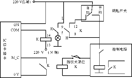 下料口的電氣設(shè)計(jì)原理圖如圖3所示。通過(guò)鑰匙開關(guān)可 以切換手動(dòng)模式和自動(dòng)模式,自動(dòng)模式下,首先進(jìn)行RFID射 頻認(rèn)證,然后通過(guò)RFID電子標(biāo)簽和IC卡進(jìn)行比對(duì),認(rèn)證和 比對(duì)成功后IC讀卡器繼電器端吸合及ON端和COM端導(dǎo)通, 此時(shí)繼電器K動(dòng)作,9端與5端導(dǎo)通,12端與8端導(dǎo)通,允 許下料指示燈H亮,控制電路可以控制下料口裝料。當(dāng)開始 下料時(shí)擋板關(guān)限位斷開,繼電器K1斷開,IC讀卡器門磁檢 測(cè)端口檢測(cè)到擋板開信號(hào)。當(dāng)裝料完成時(shí)控制電路關(guān)擋板,觸 發(fā)關(guān)限位時(shí),K1繼電器吸合,IC讀卡器門磁檢測(cè)端口 M_C 檢測(cè)到擋板關(guān)信號(hào)。實(shí)現(xiàn)了下料口的自動(dòng)化和智能化管理,省 去了監(jiān)裝員人工比對(duì)的環(huán)節(jié)。