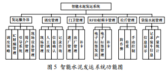 根據(jù)圖 4 所示的流程圖,該水泥發(fā)運(yùn)系統(tǒng)可分為發(fā)運(yùn)服務(wù)器軟件、調(diào)度管理軟件、門衛(wèi)管理軟件、RFID 射頻卡管理軟件、檢斤管理軟件、袋裝水泥管理軟件六部分。圖 5 是智能水泥發(fā)運(yùn)系統(tǒng)的功能圖。