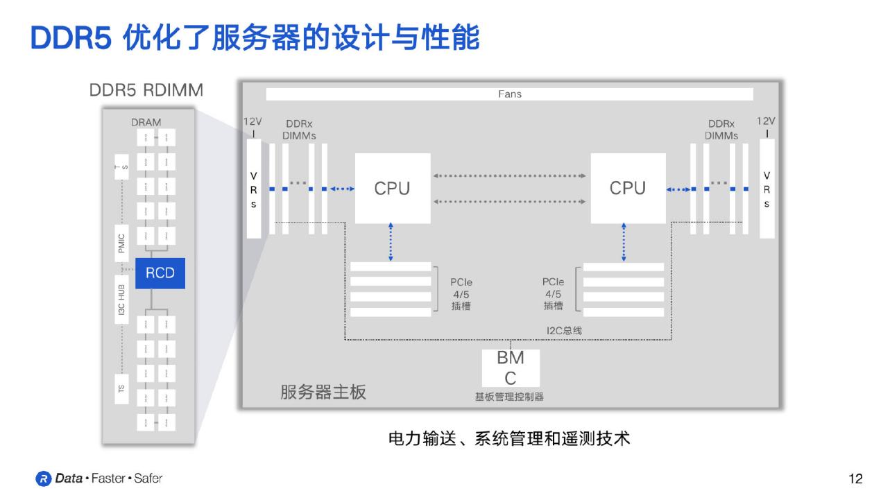 再來(lái)看DDR5 RDIMM帶來(lái)的服務(wù)器設(shè)計(jì)的變化,首先是PMIC的變化,從主板轉(zhuǎn)移到DIMM上;第二個(gè)變化是CA總線引入I3C-HUB,使得帶寬提高10倍;另外還有熱傳感器的使用,讓系統(tǒng)自主決定輸出的性能和功率。從DDR4到DDR5的遷移并不僅僅是換個(gè)內(nèi)存卡那么簡(jiǎn)單,從物理插槽的變化到供電方式、總線的變化會(huì)帶來(lái)數(shù)據(jù)中心中一些包括主板、CPU等在內(nèi)的很多重新設(shè)計(jì)的工作,但這種遷移對(duì)于云服務(wù)商而言意義更為重大。DDR4已經(jīng)存在了數(shù)年,而DDR5的起始速率就已經(jīng)達(dá)到了4800MT/s,未來(lái)還將會(huì)變得更高,Rambus也在第二代RCD的參數(shù)設(shè)定為了5600 MT/s,留出了一定余量。對(duì)于數(shù)據(jù)中心用戶(hù)而言,這種遷移帶來(lái)的優(yōu)勢(shì)遠(yuǎn)遠(yuǎn)超過(guò)和覆蓋了其遷移帶來(lái)的成本代價(jià)。
