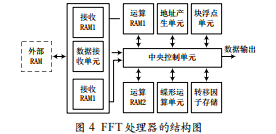 FFT 算 法 的 FPGA 硬 件 實(shí) 現(xiàn) 在 Altera 公 司 的MAX+plusⅡ系統(tǒng)環(huán)境下開發(fā)完成,選用基于查找表結(jié)構(gòu)內(nèi)嵌存儲(chǔ)器的 APEX20 系列 FPGA 器件。圖 4 為 FFT 處理器的結(jié)構(gòu)圖。本設(shè)計(jì)采用單元結(jié)構(gòu)設(shè)計(jì)思路,整個(gè)處理器由數(shù)據(jù)接收單元、運(yùn)算單元、旋轉(zhuǎn)因子存儲(chǔ)單元、地址產(chǎn)生單元和中央控制單元 5 個(gè)單元組成,各單元在中央控制單元的控制下協(xié)調(diào)工作。其中,內(nèi)部接收單元采用乒乓 RAM 結(jié)構(gòu),擴(kuò)大了數(shù)據(jù)吞吐量,計(jì)算單元采用流水與并行結(jié)合的結(jié)構(gòu),加快了運(yùn)算速。