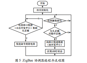 信息處理平臺的ZigBee協(xié)調(diào)器模塊通過ZigBee點對點無線通信協(xié)議,負責(zé)接收和匯聚各傳感器采集到的感測信息,并將接收到感測數(shù)據(jù)通過RS232串口傳輸?shù)綉?yīng)用開發(fā)平臺;同時,負責(zé)從RS232串口接收從應(yīng)用開發(fā)平臺下達的控制命令,并通過ZigBee無線通信協(xié)議將控制命令發(fā)送到ZigBee繼電器節(jié)點(電燈)。具體程序流程如圖5所示。