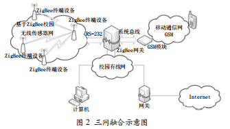 本智慧校園網(wǎng)采用如圖2所示的方案進(jìn)行校園有線網(wǎng)、 基于ZigBee的校園無(wú)線傳感器網(wǎng)和移動(dòng)通信網(wǎng)的融合,即通 過(guò)ZigBee網(wǎng)關(guān)設(shè)備的使用實(shí)現(xiàn)三者的融合。