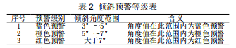 得到角度值之后要與預(yù)警范圍進(jìn)行比較,到達(dá)預(yù)警級(jí)別后發(fā)送短信,由于與牌匾相關(guān)的規(guī)范中還未涉及角度相關(guān)規(guī)定,因此我參考桿塔傾斜的相關(guān)規(guī)范,根據(jù)牌匾高度和材質(zhì)指定預(yù)警級(jí)別,最后共分3個(gè)等級(jí),見表2。