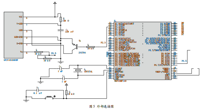 GP2Y1010AU0F外部接線圖如圖5所示。電阻起限流 作用。晶體管Q可以增加傳感器3號(hào)腳的驅(qū)動(dòng)能力,R6選擇 10 kQ 電阻,Q1使用 8050 (NPN 管)。MSP430F149 的 P1.2 作 為脈沖信號(hào)的輸入腳為傳感器提供輸入信號(hào)。電阻R3和電容C4分別為150。和220 uF的電解電容。P6.5為MSP430F149 內(nèi)部ADC的5號(hào)模擬輸入引腳,傳感器輸出的模擬信號(hào)通過 單片機(jī)進(jìn)行轉(zhuǎn)換。R4和R5起分壓作用,電阻都為10 kQ,因 為對(duì)于MSP430F149單片機(jī)來說,驅(qū)動(dòng)電壓為3.3 V,而對(duì)于 傳感器而言,需要提供5 V的電壓,輸出電壓有可能會(huì)超過 3.3V。