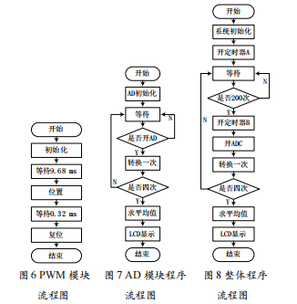 本次設(shè)計(jì)軟件部分可大致分為PWM模塊程序、ADC模 塊程序、LCD1602顯示模塊程序、定時(shí)器模塊程序、主程序 模塊程序等。