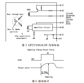 GP2Y1010AU0F內(nèi)部結(jié)構(gòu)如圖3所示,其結(jié)構(gòu)為紅外發(fā) 光二極管和光敏三極管是對(duì)角布置的裝置,檢測空氣中的塵 埃所反射的光。