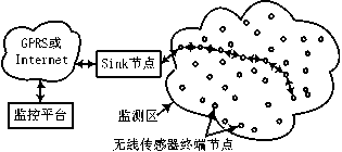 無線傳感器網(wǎng)絡系統(tǒng)通常是由若干傳感器節(jié)點、一個匯 聚(Sink)節(jié)點和后臺監(jiān)控平臺構(gòu)成,如圖3所示。傳感器 節(jié)點散布在監(jiān)測區(qū)域內(nèi),每個節(jié)點都可以采集數(shù)據(jù)和轉(zhuǎn)發(fā)相鄰 節(jié)點數(shù)據(jù),并用平面自組多跳路由(Multi-hop)無線方式把數(shù) 據(jù)傳送到匯聚點,匯聚節(jié)點直接與互聯(lián)網(wǎng)以有線的方式相連, 通過互聯(lián)網(wǎng)或其它網(wǎng)絡通訊方式將監(jiān)測信息傳送到后臺監(jiān)控 平臺。同樣地,用戶可以通過后臺監(jiān)控平臺進行命令的發(fā)布, 告知傳感器節(jié)點收集監(jiān)測信息。