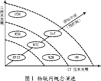電子產(chǎn)品代碼(ElectronicProductCode,EPC)是早期國(guó)際上典型的物聯(lián)網(wǎng)概念模型,它的本質(zhì)就是RFID技術(shù)加互聯(lián)網(wǎng)。由圖1可以看出,物聯(lián)網(wǎng)的技術(shù)源頭即為RFID技術(shù)。
