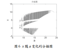 由圖5可發(fā)現(xiàn),在a∈(8,10)時,系統(tǒng)的Lyapunov指數(shù)有一個為負(fù),一個有時為正有時為零,一個有時為負(fù)有時為零,所以該系統(tǒng)在區(qū)間(8,10)之間不斷的在混沌、周期和擬周期之間切換;在a∈(10,21)時,系統(tǒng)的Lyapunov指數(shù)有兩個為負(fù),一個為正,并且存在兩個周期窗口。由觀察發(fā)現(xiàn)Lyapunov指數(shù)圖和分岔圖的變化相對應(yīng),所以該系統(tǒng)在區(qū)間(10,21)之間是出于混沌狀態(tài)的。