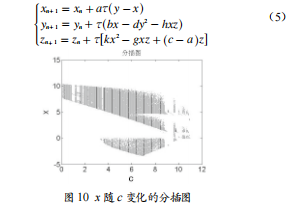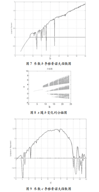 固定參數(shù)a=11,c=8,h=2,k=4,d=0.1,g=0.1,初值取為(0.1,0.1,0.1)時,Lyapunov指數(shù)隨系統(tǒng)參數(shù)b變化的指數(shù)圖譜如圖7所示,變量x隨參數(shù)b變化的分岔圖如圖8所示,系統(tǒng)參數(shù)b在區(qū)間(8.4,22.4)變化時,系統(tǒng)不斷在混沌狀態(tài)和擬周期狀態(tài)之間變化,當(dāng)b>22.4時,系統(tǒng)是處于混沌狀態(tài)的。固定參數(shù)a=11,b=25,h=2,k=4,d=0.1,g=0.1,初值取為(0.1,0.1,0.1)時,Lyapunov指數(shù)隨系統(tǒng)參數(shù)c變化的指數(shù)圖譜如圖9所示,變量x隨參數(shù)c變化的分岔圖如圖10所示,圖5、圖7和圖9中另一條指數(shù)圖一直是負(fù)數(shù),未在圖中顯示,系統(tǒng)參數(shù)c在區(qū)間(0,2.3)和(9,11)區(qū)間變化時,系統(tǒng)在混沌狀態(tài)和擬周期狀態(tài)間變化,當(dāng)系統(tǒng)參數(shù)c∈(2.3,9)時,系統(tǒng)處于混沌狀態(tài)。