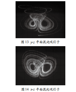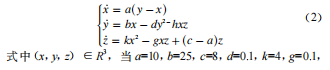式中(x,y,z)∈R3,當(dāng)b=25,k=1,c=2.5,h=4,a∈(3.5,12.5)之間變化,初值取(0.1,0.1,0.1)時,系統(tǒng)處于混沌狀態(tài)。