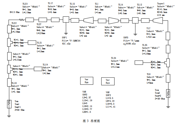 匹配電路設(shè)計完成后,再利用軟件進行進一步的優(yōu)化設(shè) 計。先釆用Random方式優(yōu)化,然后使用Gradient優(yōu)化。經(jīng)過反復(fù)的優(yōu)化后,在根據(jù)具體的參數(shù)手動調(diào)節(jié)匹配網(wǎng)絡(luò), 以達到指標(biāo)要求。選取的射頻介質(zhì)基板的參數(shù)為:介電常數(shù) £「二2.65,基板厚度H=0.5 mm,Tan D=0.003。圖 3 是經(jīng)過匹 配后的原理圖。