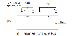 HMC564LC45 的 Vdd1,Vdd2 均為 3.5 V。這兩款芯片的偏置電路設(shè)計如圖 1 ~圖 2 所示。