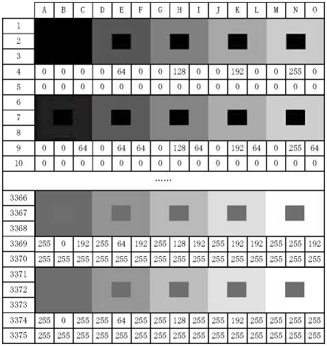 對比色配色方案基本圖譜一般是“回”字形,用數(shù)字化定義可釆用九宮格來實(shí)現(xiàn)。主色在九宮格中央,背景色分布在 周圍,在視覺上形成“回”字形圖譜叫 為研究方便,在圖譜 的下面6個(gè)單元格分別標(biāo)注主色和背景色的數(shù)值,如圖1所示: