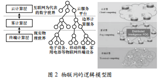 在物聯(lián)網(wǎng)的最佳實(shí)踐中,應(yīng)用、存儲和計(jì)算等服務(wù)盡可 能位于距傳感器和設(shè)備等“物體”更近的位置,這正是霧計(jì)算 產(chǎn)生的背景,在圖2所示的物聯(lián)網(wǎng)的邏輯模型中,終端計(jì)算層 主要服務(wù)于物聯(lián)網(wǎng)的傳感器層和信息匯聚層,霧計(jì)算層主要服 務(wù)于物聯(lián)網(wǎng)的信息分析層和數(shù)據(jù)傳輸層,云計(jì)算層主要服務(wù) 于物聯(lián)網(wǎng)的應(yīng)用服務(wù)層。其中傳感器層是物聯(lián)網(wǎng)的皮膚和五官, 主要用于識別物體,采集信息;信息匯聚層是物聯(lián)網(wǎng)的神經(jīng)中 樞網(wǎng)和血管網(wǎng),負(fù)責(zé)數(shù)據(jù)信息的收集閱讀器接收到來自電子標(biāo) 簽的載波信息;信息分析層是將收集的數(shù)據(jù)信息送至霧計(jì)算 系統(tǒng)進(jìn)行分析、過濾和處理;數(shù)據(jù)傳輸層將信息分析層的信 息進(jìn)行分發(fā)與傳遞,傳送給云計(jì)算系統(tǒng);云計(jì)算服務(wù)的應(yīng)用 層是物聯(lián)網(wǎng)的“社會分工”一一與具體行業(yè)需求結(jié)合,實(shí)現(xiàn)廣 泛智能化。