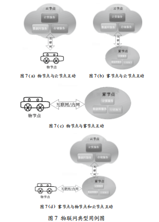 圖7 (a)描述物節(jié)點(diǎn)與云節(jié)點(diǎn)互動(dòng)的情況,是在物聯(lián)網(wǎng)早 期階段最常見的基于智能終端的物聯(lián)網(wǎng)用例。智能終端可以輕 松訪問云節(jié)點(diǎn),使用云端的計(jì)算、存儲和數(shù)據(jù)服務(wù)。