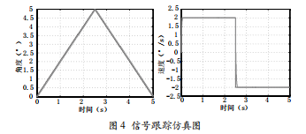 根據(jù)轉(zhuǎn)臺(tái)的特點(diǎn)設(shè)計(jì)出基于位置環(huán)和速度環(huán)的PID控制 器,控制系統(tǒng)的Simulmk框圖如圖3所示,仿真效果如圖4 所示。從仿真結(jié)果可以看出該控制系統(tǒng)可以實(shí)現(xiàn)較高精度的位 置跟蹤和速度跟蹤。