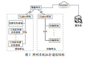 在圖 2 可以看到智能照明通信系統(tǒng)采用了 CAN 總線、ZigBee無線網路和以太網三種網路。ZigBee具有低功耗、低 成本和組網能力強的特點,但是它傳輸距離只有75 m,因 此遠距離傳輸部分采用了以太網。感知單元的所有元器件通 過CAN總線連接到ZigBee模塊,每個元器件均分配唯一的 單元地址。當感知單元的元器件采集到信息后,將其傳輸?shù)?ZigBee模塊,ZigBee模塊再將信號傳輸?shù)骄W關,網關收到 信息后進行判斷,繼而控制相應回路輸出。ZigBee模塊將控 制信息發(fā)送到控制模塊,控制模塊實現(xiàn)對照明燈的開關控制。 控制模塊是一種靠繼電器輸出開關量的元件。