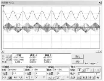開啟仿真后可以可在雙蹤示波器上看到低頻調(diào)制信號與 普通調(diào)幅信號波形對比圖,如圖2所示。