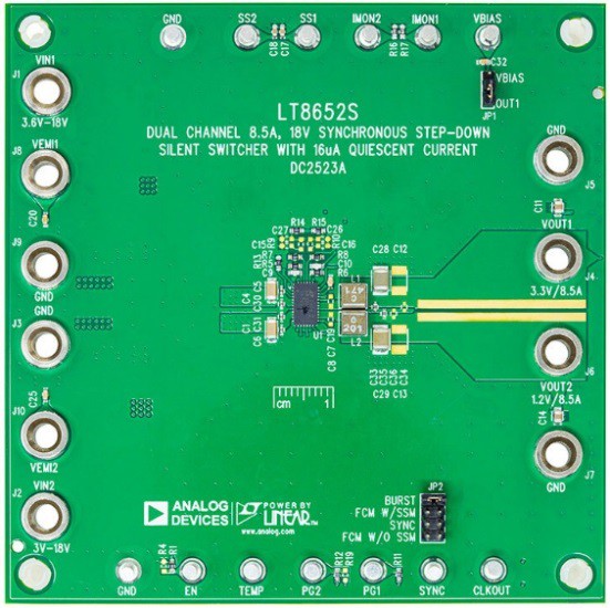 此電路板的原理圖如圖2所示。在此解決方案中,轉(zhuǎn)換器使用LT8652S的兩個(gè)通道,在2 MHz的頻率下運(yùn)行,并在8.5 A下產(chǎn)生3.3 V電壓,在8.5 A下產(chǎn)生1.2 V電壓。可輕松修改此電路以產(chǎn)生包括3.3 V和1.8 V、3.3 V和1 V等在內(nèi)的輸出組合?;蛘?,為了利用LT8652S的寬輸入范圍,LT8652S可用作二級(jí)轉(zhuǎn)換器,再使用12 V、5 V或3.3 V前置穩(wěn)壓器,以提高總效率和功率密度性能。由于高效率和出色的熱管理,LT8652S可同時(shí)為每個(gè)通道提供8.5 A,17 A用于并行輸出,高達(dá)12 A用于單通道操作。借助3 V至18 V輸入范圍,該器件可覆蓋FPGA/SoC/微處理器應(yīng)用的大多數(shù)輸入電壓組合。
