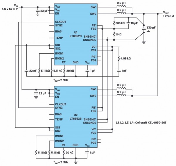 圖7顯示兩個(gè)并聯(lián)的轉(zhuǎn)換器可在1 V時(shí)提供34 A輸出電流。通過將U1的CLKOUT連接至U2的SYNC,使主單元時(shí)鐘與從單元同步。由此產(chǎn)生的每通道90°相位差減少了輸入電流紋波,并將熱負(fù)載擴(kuò)散到電路板上。