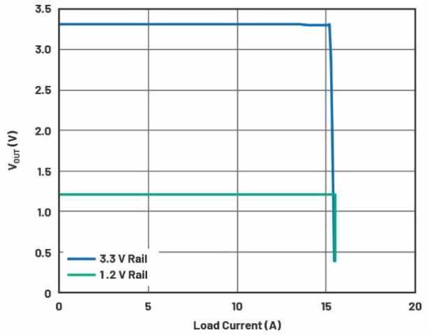 對(duì)于高電流應(yīng)用,每一英寸PCB線路都會(huì)導(dǎo)致大幅壓降。對(duì)于現(xiàn)代核心電路中需要極窄電壓范圍的典型低電壓、高電流負(fù)載,壓降會(huì)導(dǎo)致嚴(yán)重的問題。LT8652S提供差分輸出電壓檢測(cè)功能,允許客戶創(chuàng)建開爾文連接,以實(shí)現(xiàn)輸出電壓檢測(cè)和直接從輸出電容進(jìn)行反饋。它可以校正最高±300 mV的輸出接地線路電位。圖4顯示LT8652S利用差分檢測(cè)功能對(duì)兩個(gè)通道進(jìn)行負(fù)載調(diào)整。