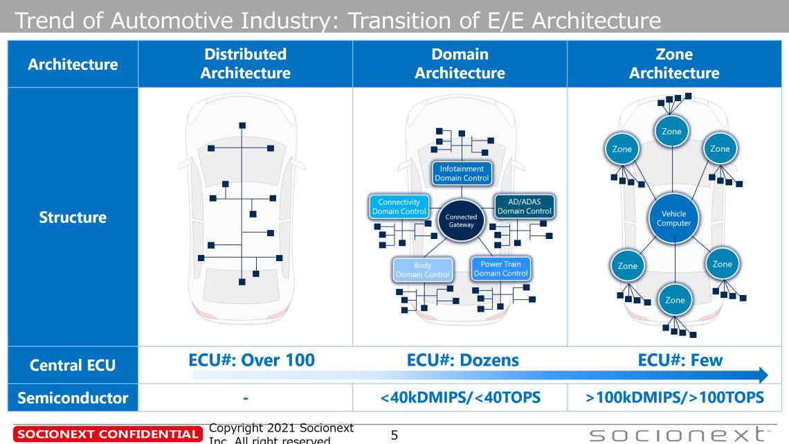 除了在汽車(chē)市場(chǎng)20多年的經(jīng)驗(yàn)外,Socionext在系統(tǒng)開(kāi)發(fā)方面擁有豐富多樣的技術(shù)訣竅,如低功耗、大規(guī)模、高速和高性能設(shè)計(jì),涉足領(lǐng)域包括:消費(fèi)、網(wǎng)絡(luò)、數(shù)據(jù)中心和工業(yè)市場(chǎng)。為了適應(yīng)CASE時(shí)代的變化,Socionext有能力將采用舊工藝技術(shù)的現(xiàn)有汽車(chē)SoC開(kāi)發(fā)模式演變?yōu)橐云?chē)SoC為旗艦、使用先進(jìn)工藝技術(shù)的新模式。
