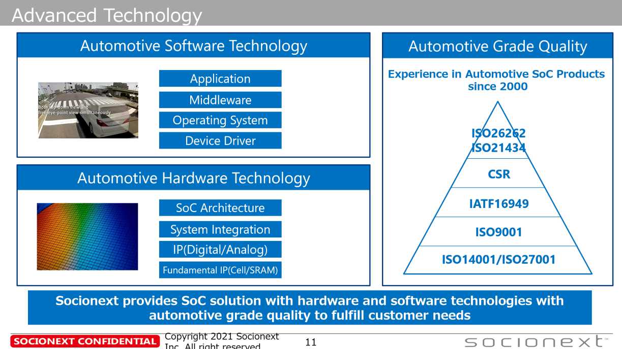 通過(guò)這三個(gè)要素,Socionext可以使用具有汽車(chē)級(jí)質(zhì)量的硬件和軟件技術(shù)提供SoC解決方案。Socionext為SoC解決方案提供具有汽車(chē)級(jí)質(zhì)量的硬件和軟件技術(shù),以滿(mǎn)足客戶(hù)需求。