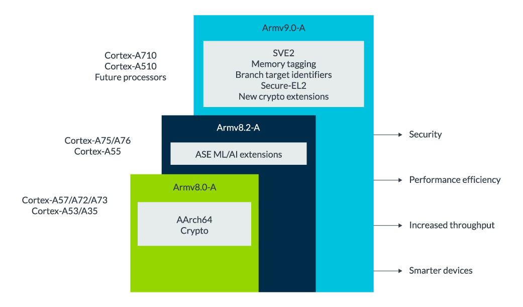 另外,從 Armv8 架構中的可收縮矢量擴展(Scalable Vector Extension, SVE)和 Armv9 架構中的 SVE2 開始,Arm 通過對 Neon 的擴展在成像和機器學習方面取得了進展,這一點也很重要。