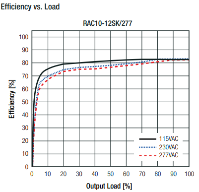 以 10W AC/DC 電源(例如 RAC10-12SK/277)的典型效率/負載圖為例: