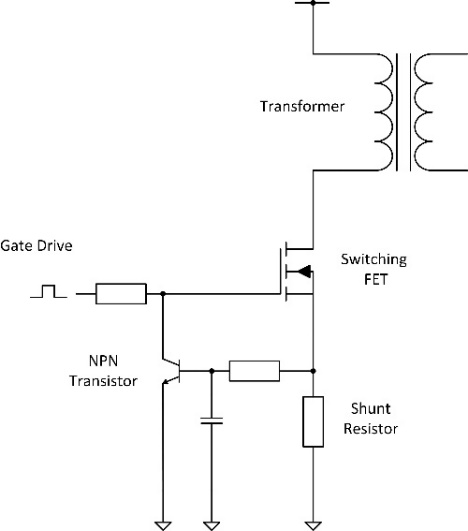 圖 5:基本的過流保護。電流取樣電阻器兩端的電壓超過 0.7V 時會導(dǎo)通NPN 晶體管并斷開功率 FET 的柵極驅(qū)動。