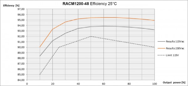 輸入電壓范圍為 85VAC 至 264VAC。RACM1200-V 提供 1000W 輸出功率,配備接觸式冷卻的金屬外殼,體積僅 102mm x 229mm x 40mm。輸出功率可達(dá)1200W并維持10秒以上。然而,若要1200W 連續(xù)輸出就需要配備風(fēng)扇并確保有2.5m/s的空氣流動(dòng)。風(fēng)扇可由用戶控制,為此提供了一個(gè)可控的輔助輸出以進(jìn)行溫度管理。