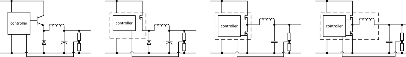 多年以來(lái),人們盡可能地將更多的器件件集成到控制電路來(lái)降低成本和縮小尺寸。其中一個(gè)突破發(fā)展是將主開關(guān) S1 直接集成到控制器 IC 中,但線圈和二極管仍必須安裝在外面。后來(lái)為了進(jìn)一步提高效率,在新版中SW1 和 SW2開關(guān)都配備了 MOSFET,開關(guān)頻率因此可高至 2MHz。