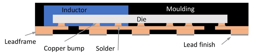 最簡(jiǎn)單的例子是引線框倒裝芯片 (FCOL) 封裝技術(shù);控制器 IC(具集成功率晶體管)直接倒置連接到引線框沖壓網(wǎng)格,旁邊是同樣直接連接到引線框架的SMD 電感(圖 3)。