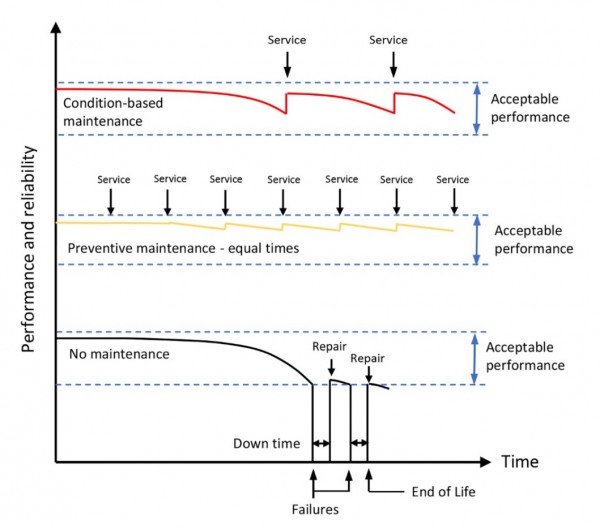 大多數(shù)的流程為了更好地保持生產(chǎn)量依靠定期的「預防性」維護和檢查。簡單的機械系統(tǒng)要定期更換過濾器和機油、檢查軸承或調(diào)整間隙等。在電子產(chǎn)品方面,可能會更換正常運作但老舊的保險絲、避雷器和電解電容器。決定何時采取行動并不容易,太晚執(zhí)行可能導致破壞性故障,太早更換可能將好的零件丟棄造成不必要的工作和成本浪費。因此時間安排是一個挑戰(zhàn),根據(jù)使用時間、使用情況或只是靠直覺和經(jīng)驗來安排工作。高可用性系統(tǒng)通常會進行故障模式、影響及危害性分析 (FMECA),在科學的基礎上預測故障頻率及影響。這樣可以盡可能減少零件庫存并在適當?shù)臅r間安排維護工作。