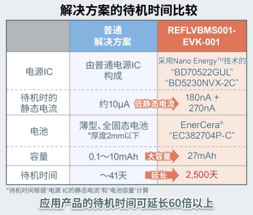 本評(píng)估板“REFLVBMS001-EVK-001”使用了厚度為0.45mm、電池容量為27mAh的二次電池“EnerCera® EC382704P-C”,由搭載了“Nano Energy?”技術(shù)的待機(jī)靜態(tài)電流180nA的超低功耗IC“BD70522GUL”作為高效電源,由支持2.0V~4.7V充電電壓的充電控制IC“BD71631QWZ”負(fù)責(zé)適合電池的充電、監(jiān)控和放電控制,這些器件共同構(gòu)成蓄電單元。包括用來檢測(cè)異常電壓的復(fù)位IC“BD5230NVX-2C”在內(nèi),待機(jī)時(shí)的靜態(tài)電流非常低,不僅可以為應(yīng)用產(chǎn)品提供毫無浪費(fèi)的電源功能,與普通的解決方案相比,還能將應(yīng)用產(chǎn)品的待機(jī)時(shí)間延長60倍以上。本評(píng)估板可以輕松評(píng)估這種解決方案。此外,所有安裝元器件的厚度都在0.60mm以下,加上PCB板的厚度也僅有1.60mm的超薄厚度,因此還可以作為參考設(shè)計(jì)直接裝入卡片型物聯(lián)網(wǎng)設(shè)備(智能卡)中。