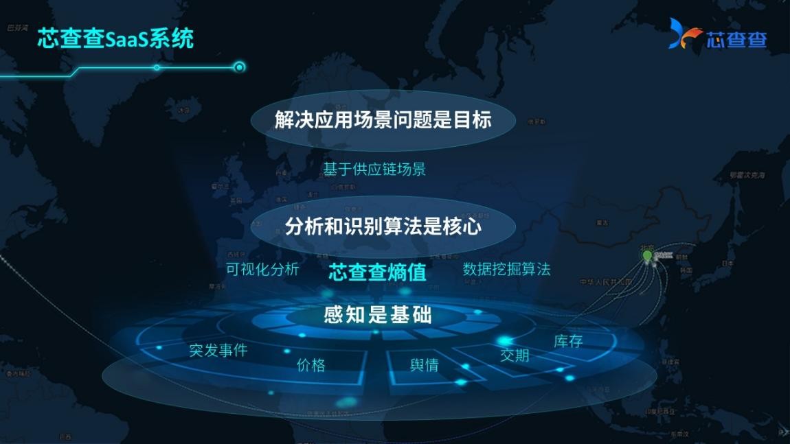 在芯查查SaaS系統(tǒng)中:感知是基礎(chǔ),芯查查SaaS系統(tǒng)可對(duì)突發(fā)事件、交期、庫(kù)存、價(jià)格、輿情進(jìn)行及時(shí)感知;分析和識(shí)別算法是核心,通過(guò)芯查查熵值、可視化分析和數(shù)據(jù)挖掘算法,芯查查SaaS系統(tǒng)可識(shí)別各場(chǎng)景情況,提供科學(xué)合理的解決方案;解決應(yīng)用場(chǎng)景問(wèn)題是目標(biāo),基于電子信息行業(yè)的供應(yīng)鏈場(chǎng)景,以實(shí)際情況為切入點(diǎn),快速、精準(zhǔn)地解決客戶問(wèn)題。