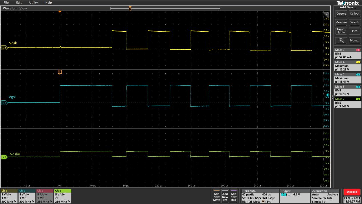Vgsh為上管驅(qū)動波形、Vgsl為下管驅(qū)動波形、Vgshin為上管輸入側(cè)驅(qū)動波形。該結(jié)果為測試板上電狀態(tài)下發(fā)送一個雙脈沖驅(qū)動下管,同時上管為互補的驅(qū)動波形,圖中可以看出在上管輸入驅(qū)動波形為“開通”狀態(tài)下,上管GS并沒有及時開通而是經(jīng)過40us左右延遲后才開始跟隨輸入驅(qū)動信號狀態(tài),這是因為在初始狀態(tài)下上管驅(qū)動芯片沒有得電,在下管導(dǎo)通后上管驅(qū)動芯片電源才開始得電。從驅(qū)動芯片得電后到芯片可以正常工作大概有幾十us的延遲,所以才導(dǎo)致圖上現(xiàn)象的產(chǎn)生,這也是自舉電路存在問題,該問題可以通過增加D1、R1通過母線電壓對Cboot電容進行預(yù)充電解決。