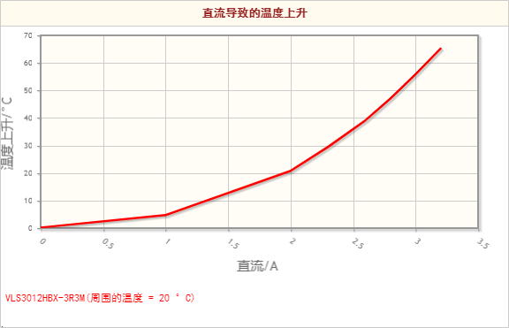 5.溫升電流(Irms)。該參數(shù)一般是指電感表面溫度相比環(huán)境溫度上升40攝氏度時(shí)的電流大小,電感表面的溫度會(huì)隨著通過其電流的增大而升高,因此,在實(shí)際使用過程中應(yīng)注意該參數(shù)的大小,特別是高溫環(huán)境中的電感的選擇此參數(shù)應(yīng)降額使用。電感的溫升曲線如下圖所示: