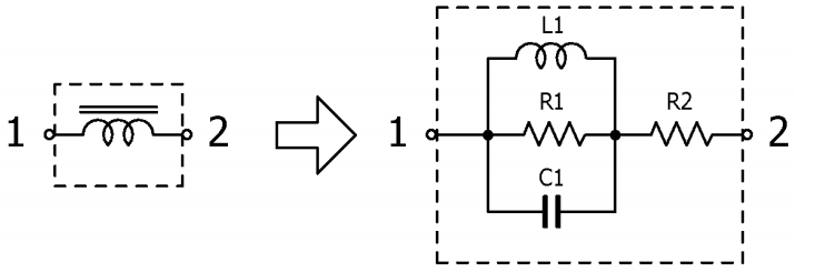 9.等效電路。電感的高頻等效模型如下圖所示,其中L1為電感值,R1為交流等效電阻,C1為寄生電容,R2為直流等效電阻。通過該模型,能夠清晰的看到電感各個(gè)等效因子對(duì)其特性曲線的影響。