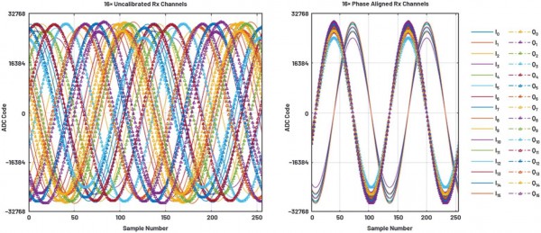 此外,相位偏移模塊經(jīng)常部署在NCO的輸出,如圖2所示。這些相位偏移可按照系統(tǒng)內(nèi)的通用基線參考來校正通道間相位偏差。由于每個DUC和DDC都有自己的NCO,因此只需針對給定的NCO頻率來偏移一個確定量的NCO相位,便可實現(xiàn)系統(tǒng)每個通道的相位對齊。這樣一來,在使用時遇到可用的多芯片同步算法時,所有通道間的確定性相位關(guān)系可通過這些NCO相位偏移進行校正1。 圖3顯示了實現(xiàn)相位對齊(通過嚴格為每個接收數(shù)據(jù)通路設(shè)置所需的NCO相位偏移值)前后,16通道同時接收I/Q數(shù)據(jù)采集的實驗結(jié)果。請注意,這些數(shù)字校正還校正了每個通道前端網(wǎng)絡(luò)中的射頻和微波損耗。